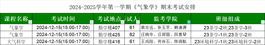 【考试安排】2024-2025学年第一学期《气象学》期末考试监考安排