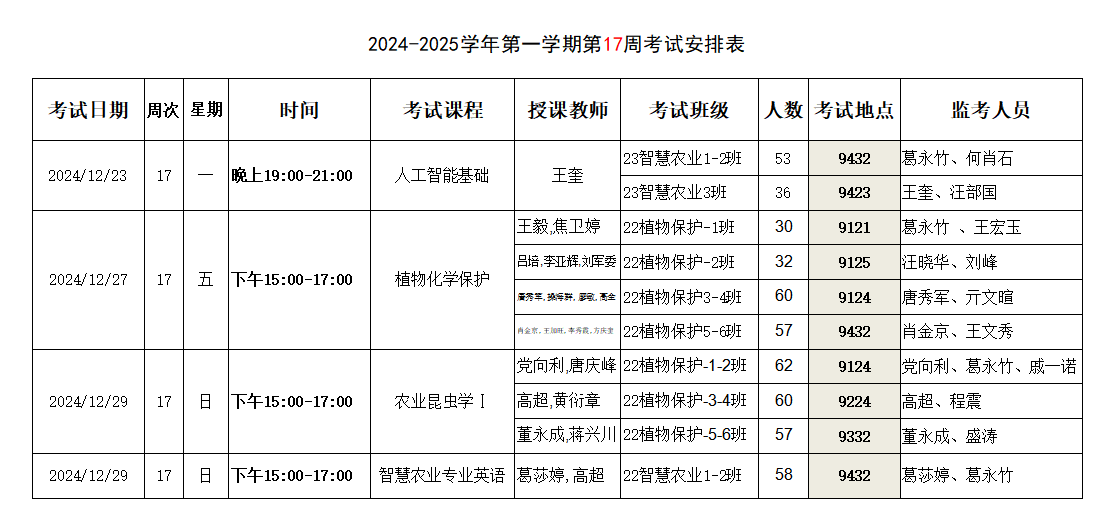 【考试安排】植物保护学院2024-2025学年第一学期第17周考试安排表