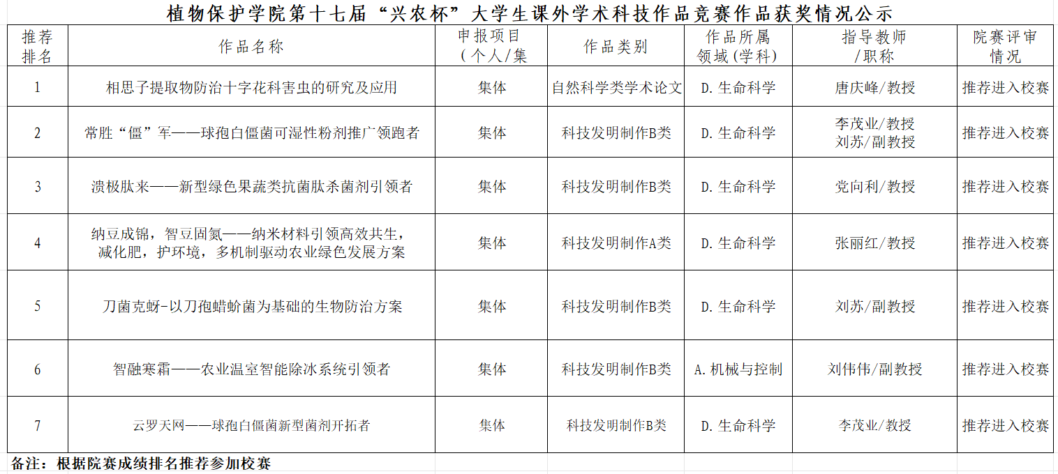 植物保护学院第十七届“兴农杯”大学生课外学术科技作品竞赛作品获奖情况公示 发布时间:2024-12-25 浏览次数: 学院全体师生:根据《关于举办第十七届“兴农杯”大学生课外学术科技作品竞赛暨2025年“挑战杯”校园选拔赛的预通知》和补充通知要求,植物保护学院举办“兴农杯”院赛选拔赛,根据参赛要求和实际推荐以下7件获奖作品进入校赛。现予以公示。公示期为:2024年12月25日-27日,公示期间若有异议,请与学院张老师联系,联系电话:0551-65780720。学院纪委邮箱:anzbxyjw@ahau.edu.cn。植物保护学院2024年12月25日