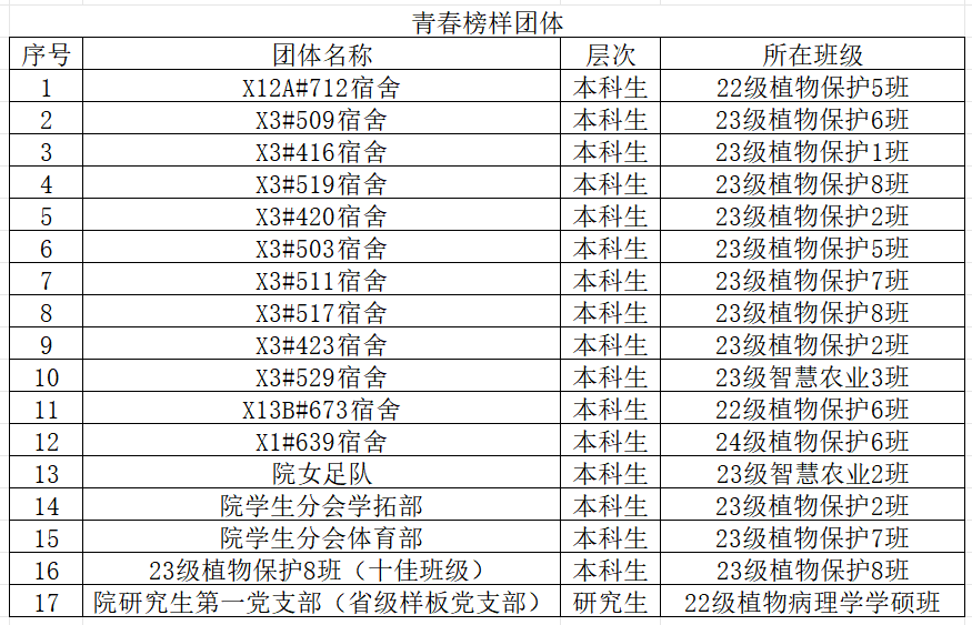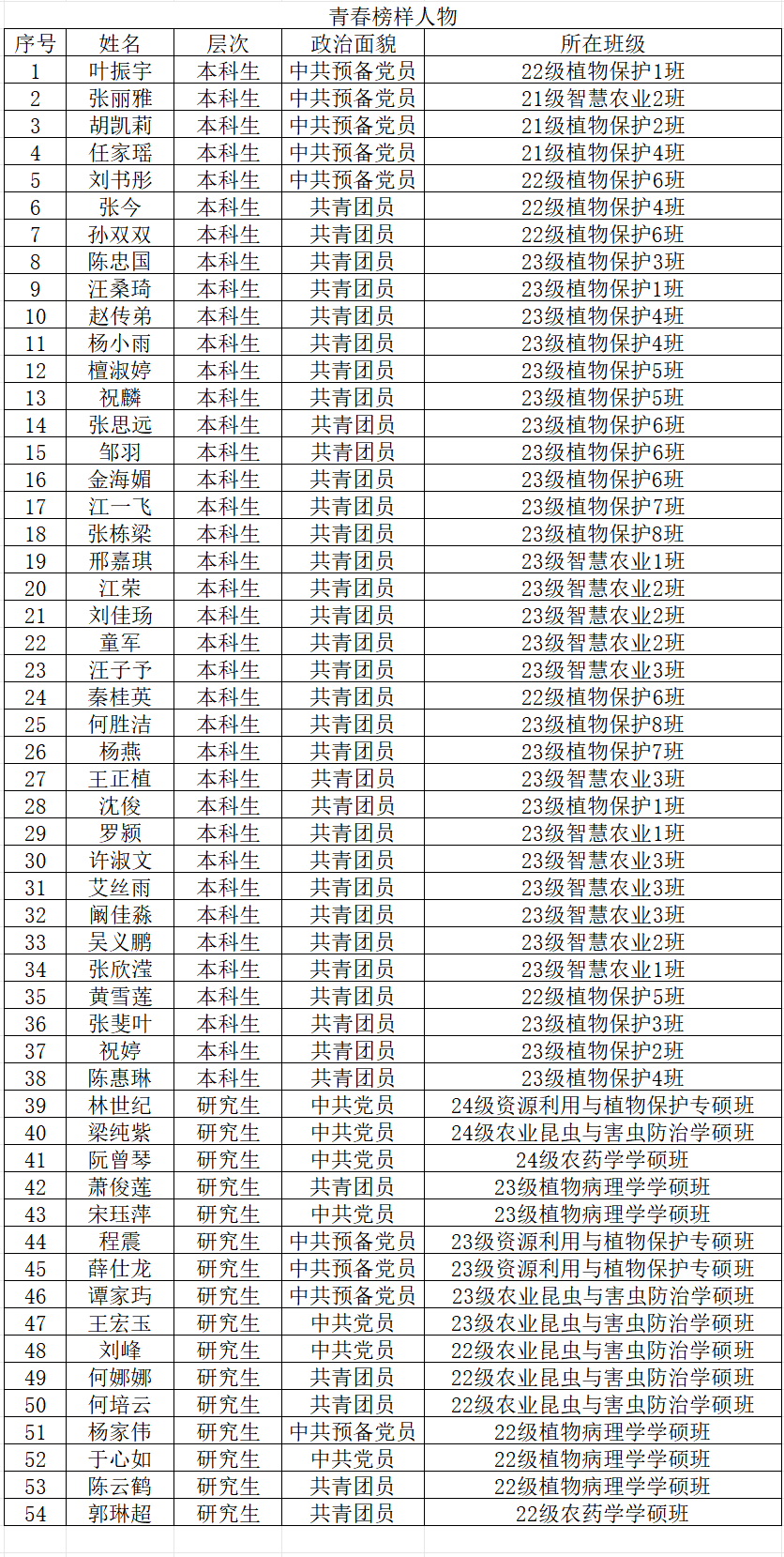 植物保护学院关于“寻找身边榜样”人物(团体)评选结果公示 发布时间:2025-01-07 浏览次数: 根据《植物保护学院关于“寻找身边榜样”人物(团体)活动的通知》的工作要求,经学生个人申请、组织推荐、学院审核评选,现将院2024年度学生青春榜样人物(团体)评选名单公示如下。如有异议,请在公示期内向学院1503办公室反映。公示期:2025年1月7日至1月10日联系人:张老师联系电话:0551-65780720联系邮箱:zbxy@ahau.edu.cn