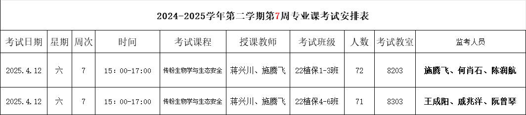 【考试安排】2024-2025学年第二学期第7周专业课考试安排
