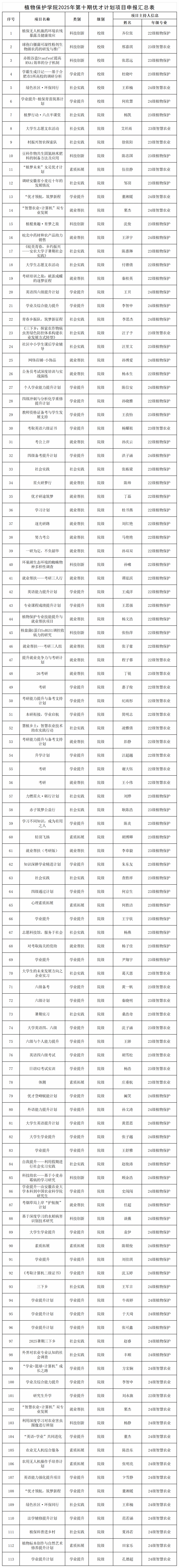 2025年第十期“优才计划”学生发展支持项目立项名单公示 发布时间:2025-05-14 浏览次数: 各班级:根据《关于申报2025年第十期“优才计划”学生发展支持项目的通知》相关要求,经学生个人申请、学院研究,拟推荐《植保无人机施药环境农残暴露及健康效应》等113个(包含6个校级)项目予以立项,现予以公示,具体名单详见附件。如有异议,请于公示期间向学院反馈。联系人:裴志远联系电话:0551-65786321E-Mail:972292197@q.com公示时间:2025年5月14日-5月16日安徽农业大学植物保护学院2025年5月14日