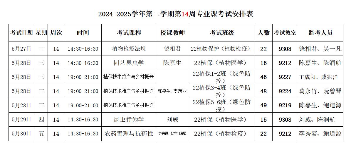 【考试安排】2024-2025学年第二学期第14周专业课考试安排