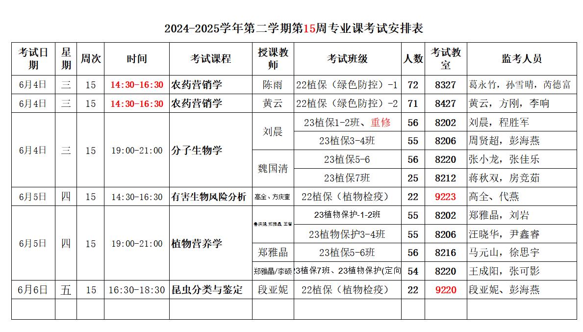【考试安排】2024-2025学年第二学期第15周专业课考试安排