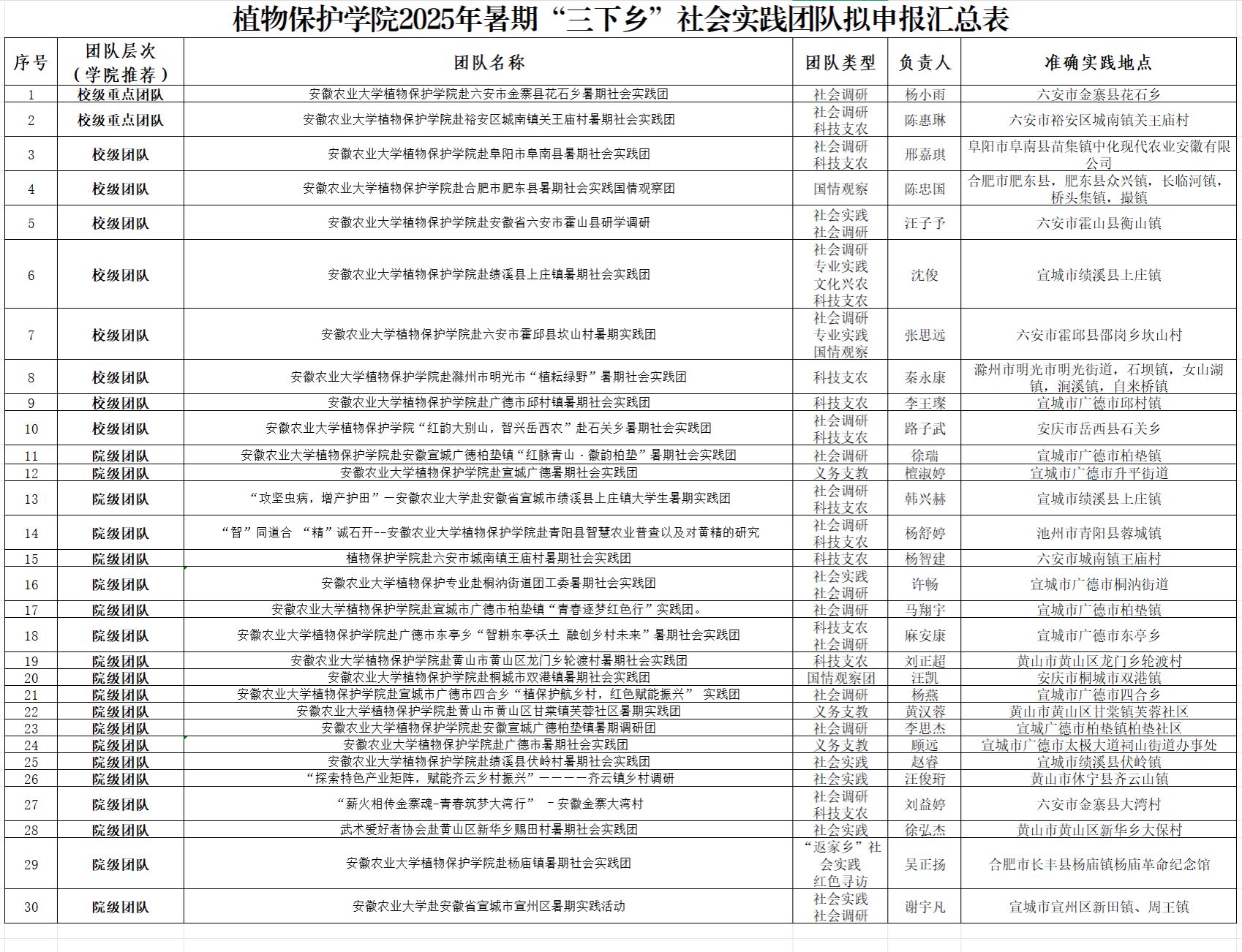 植物保护学院关于2025年暑期“三下乡”社会实践团队推荐立项情况公示 发布时间:2025-06-09 浏览次数: 各班级:根据学校《关于组织开展2025年大学生暑期“三下乡·返家乡”社会实践活动的通知》,结合班级和学院实际情况。经团队申请、学院审核和评审等流程,拟推荐2项校级重点团队、8项校级团队、20项院级团队。现将名单公示如下:植物保护学院团委2025年6月9日