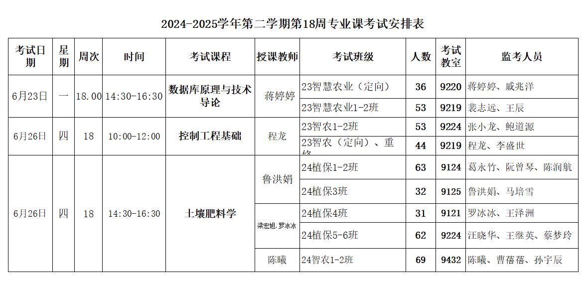 【考试安排】2024-2025学年第二学期第18周专业课考试安排