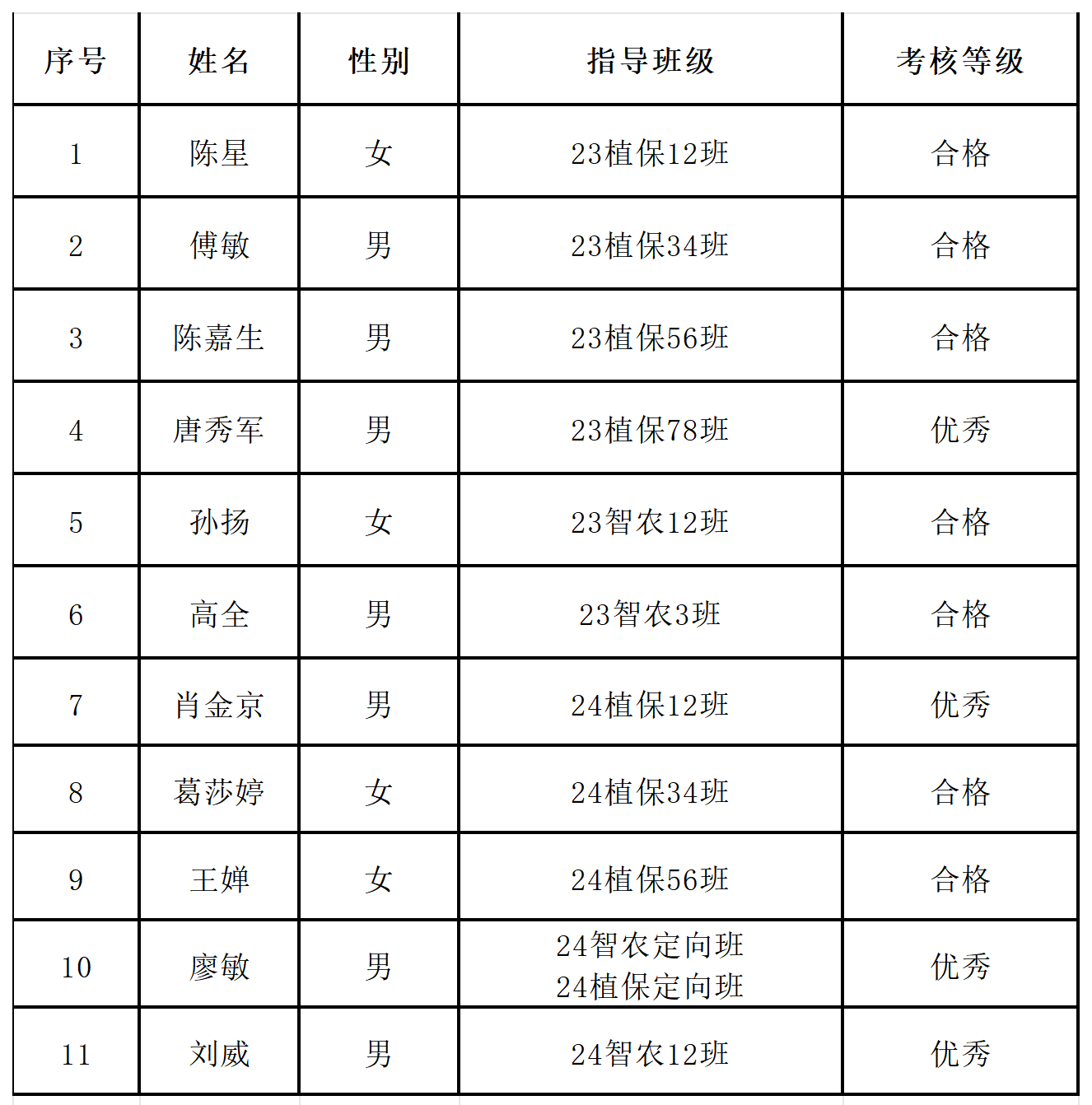 关于植物保护学院2024-2025学年本科生班级班主任考核结果公示 发布时间:2025-09-01 浏览次数: 根据《学校本科生班主任选聘工作实施办法》和学院本科生班主任岗位职责等精神,经学院研究决定,现将我院2024-2025学年本科生班级班主任考核结果公示如下,公示期为2025年9月1日至3日。公示期内如有异议,请联系党政办裴志远,联系方式:0551-65786321。植物保护学院2025年9月1日