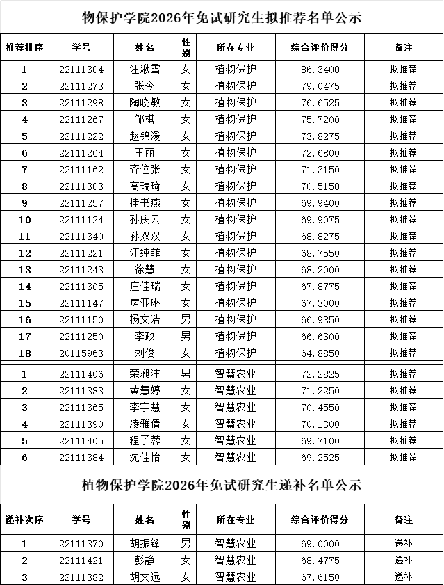 根据《安徽农业大学推荐优秀应届本科毕业生免试攻读硕士学位研究生工作实施办法》(校教发字〔2024〕8号)、《植物保护学院关于做好2026年推荐优秀应届本科毕业生免试攻读硕士研究生的通知》以及《植物保护学院推荐免试研究生实施细则》(院行字[2024]2号)文件要求,经个人申报、学院核算、申报人签字确认、院研究生推免工作领导小组审议,学院党委会、学院党政联席会研究审定,现将植物保护学院拟推荐2026年免试攻读硕士学位研究生拟推荐名单及递补名单公示如下,公示期间为2025年9月8日至9月11日。