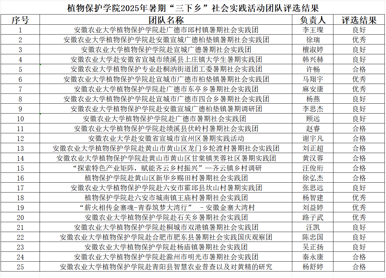 学院关于2025年暑期“三下乡”社会实践团队评选结果公示 发布时间:2025-09-16 浏览次数: 各实践团队:根据《学校关于组织开展2025年大学生暑期“三下乡·返家乡”社会实践活动的通知》和《学院关于暑期“三下乡”社会实践活动团队经费情况使用办法(暂行)》等文件要求。结合前期基础任务完成情况,经团队申请、现场答辩展示和学院审核,最终获评院级优秀团队6支,良好团队10支,合格团队9支。现将名单公示如下:植物保护学院团委2025年9月16日