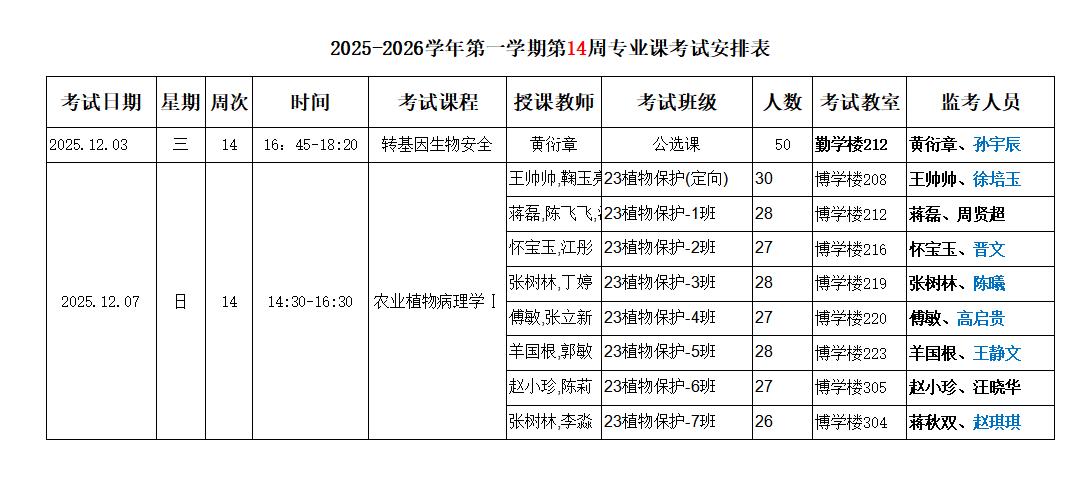 【考试安排】2025-2026学年第一学期第14周考试安排