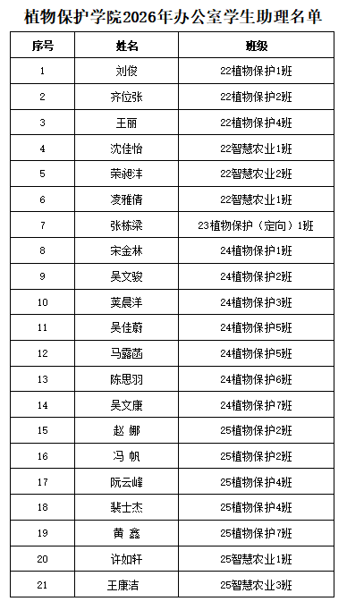 关于植物保护学院2026年办公室学生助理拟聘任人员名单的公示 发布时间:2026-01-05 浏览次数: 根据学院学生工作改革发展的需要,经研究决定,对植物保护学院办公室学生助理组织结构进行优化调整,经个人自荐、组织推荐与综合考察,拟聘任刘俊等21位同学担任植物保护学院2026年办公室学生助理,具体名单如下:如有异议,请向学院党政办反馈。联系人:裴老师联系方式:0551-65786321植物保护学院团委2026年1月5日