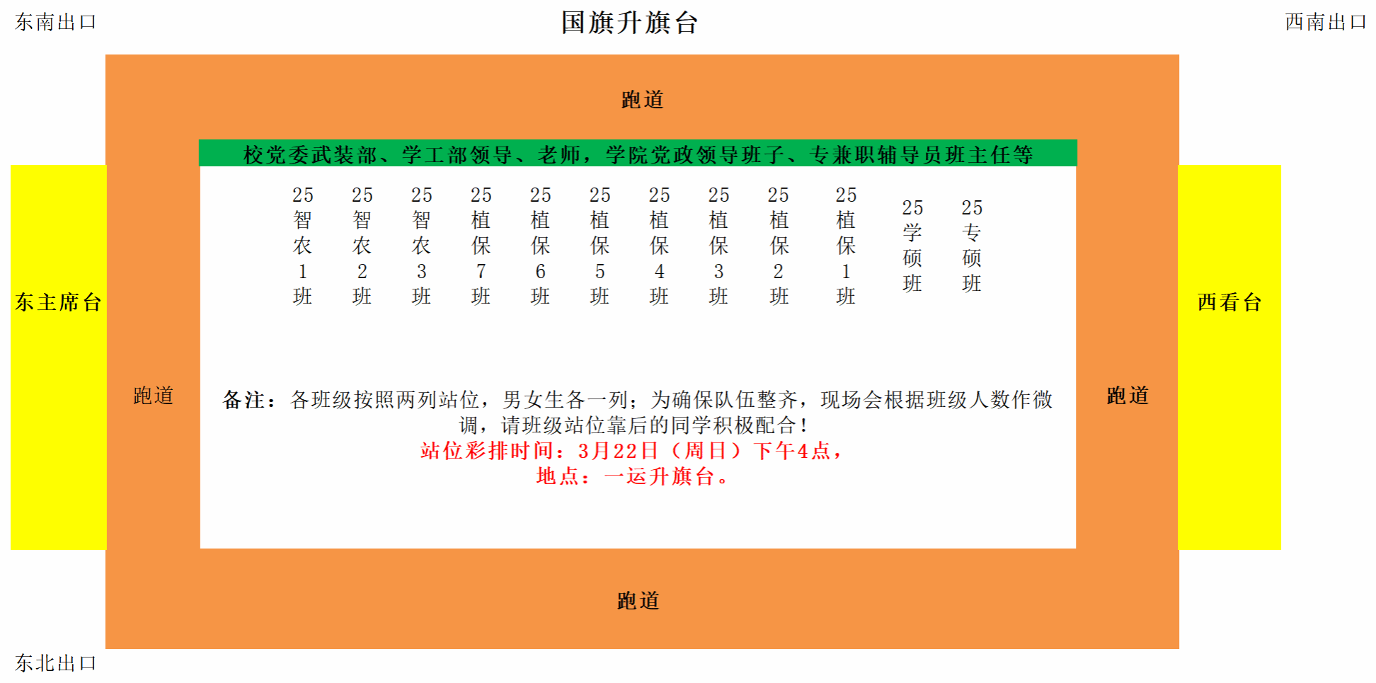 (3月22日,即本周日下午16:00在第一运动场升旗台下彩排,请节目组全体人员到场参加,各2025级班长或负责人至少1人到场参加,确定站位等注意事项)