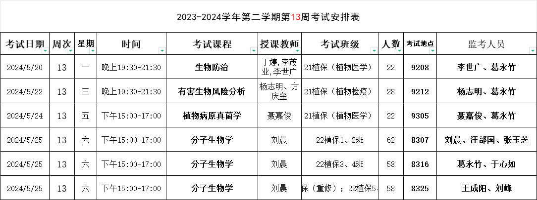 【考试安排】植物保护学院2023-2024学年第二学期第13周考试安排表