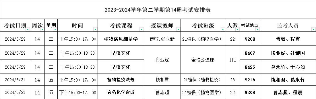 【考试安排】植物保护学院2023-2024学年第二学期第14周考试安排表