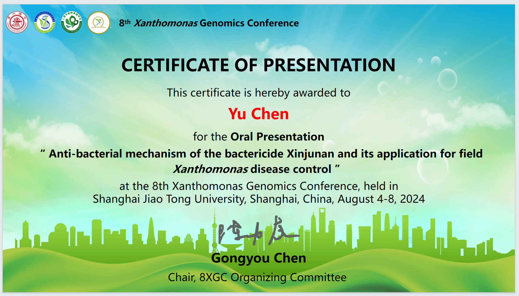 本网讯 2024年8月4日至7日,由国际黄单胞菌基因组学委员会主办,上海交通大学农业与生物学院、上海市植物病理学会和上海市现代种业协同创新中心等单位共同承办的“第八届国际黄单胞菌基因组学大会(The 8th Xanthomonas Genomics Conference)”在上海交通大学闵行校区成功召开。