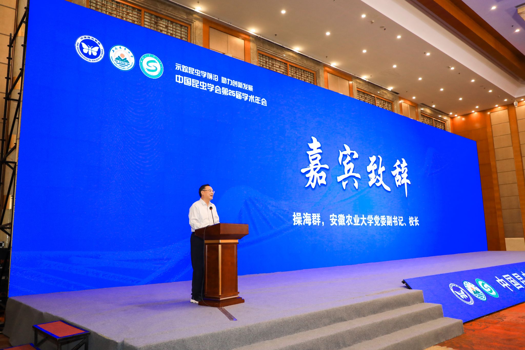 开幕式由乔格侠主持。操海群致欢迎辞。他代表学校对与会专家学者的到来表示诚挚的欢迎,并介绍了学校近年来的发展情况。他指出,此次与中国昆虫学会携手办会,既是对学校学科实力的充分认可,更是推动安徽农业科技创新的重要契机。他表示,当前安徽正推进“1+5”农业科技创新联盟建设,学校将以此次年会为契机,加强与全国昆虫学界的合作交流,为守护“江淮粮仓”、助力农业强国建设贡献力量。