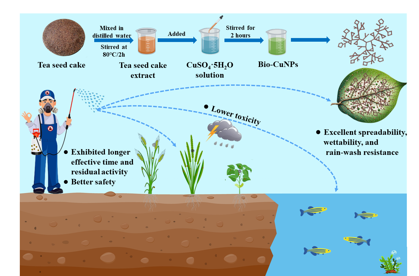 铜制杀菌剂是一种常用的保护性杀菌剂,但其不耐雨水冲刷,导致铜的瞬时大量释放,进而引发严重的环境污染与生态风险。本研究以五水硫酸铜和茶籽饼的水提取液为反应原料,利用生物合成技术成功制备纳米氧化铜(Bio-CuNPs)。这种Bio-CuNPs具有独特的树枝状三维拓扑结构,与商品化铜制剂可杀得(Kocide)相比,在番茄、水稻和小麦叶片上展现出更佳的润湿与铺展性能。室内模拟雨水冲刷试验显示,Bio-CuNPs在植物叶片表面的滞留量比Kocide高出75.89%至84.31%,表现出卓越的耐雨水冲刷能力。透射电子显微镜观察揭示,这一特性的实现得益于Bio-CuNPs的三维结构与叶片微纳结构的紧密嵌合。室内毒力测定进一步证实,Bio-CuNPs对稻瘟病菌和番茄溃疡病菌的防治效果及持效期均优于Kocide。非靶标生物安全性试验表明,Bio-CuNPs对小麦幼苗生长无影响,且对斑马鱼的毒性远低于Kocide,是其毒性的五分之一。此外,土壤生态系统评估实验显示Bio-CuNPs与大肠杆菌生物相容性良好。综上所述,Bio-CuNPs有望成为传统铜制杀菌剂的环保替代选择,展现出广阔的应用前景。