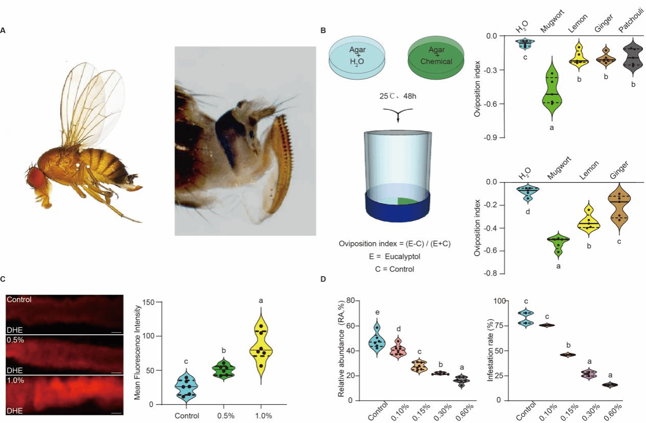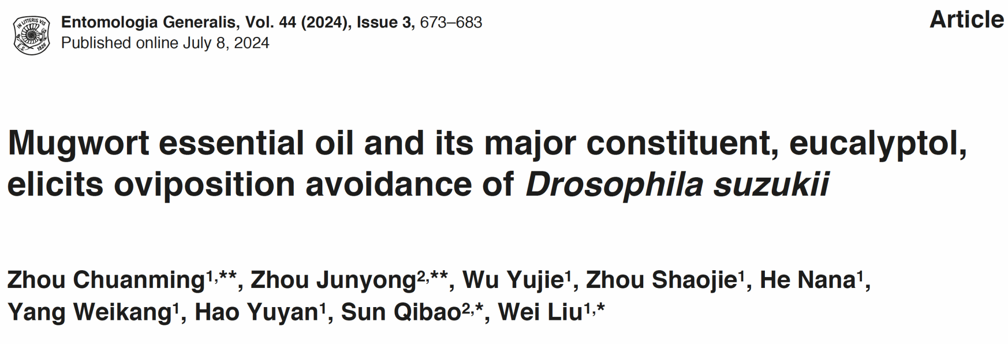 本网讯 我院刘威教授团队在昆虫学领域top期刊《ENTOMOLOGIA GENERALIS》(中科院一区)上正式发表题为“Mugwort essential oil and its major constituent, eucalyptol, elicits oviposition avoidance of Drosophila suzukii”的研究论文,报道了艾叶精油及其主成分桉叶油醇(eucalyptol)驱避辬翅果蝇产卵,从而提供了降低该害虫危害的新机制。