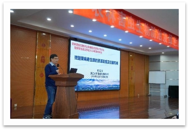 本网讯 12月7日,由安徽省昆虫学会和安徽农业大学植物保护学院昆虫学系教工党支部主办的主题为“农林害虫生物防治及绿色防控学术研讨会 暨安徽省昆虫学会2024年学术年会”在泽丽大酒店举行,会议吸引了众多昆虫学科领域专家、省内植保部门专业技术人员、农大学生及相关企业代表参加,共同探讨农林害虫生物防治与绿色防控技术。本次活动还特别邀请了美国马里兰大学帕克分校王建教授、南京农业大学洪晓月教授、浙江大学黄健华教授、江苏农科院植保所纪锐研究员和安徽省植物保护总站郑兆阳副站长进行学术汇报交流。