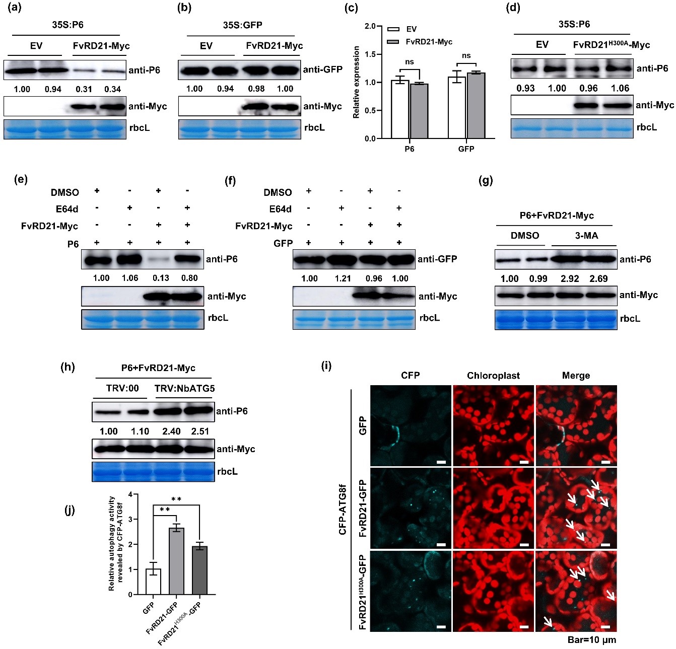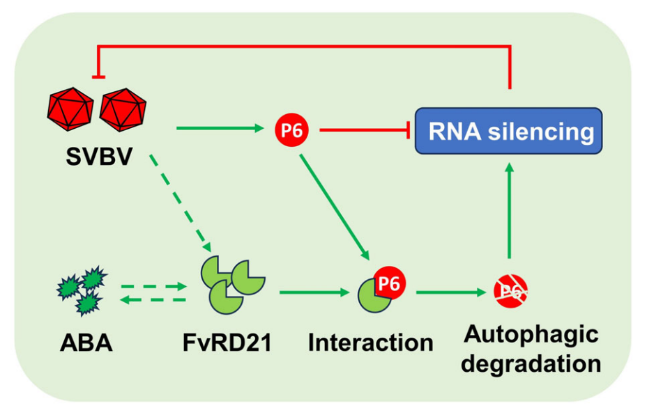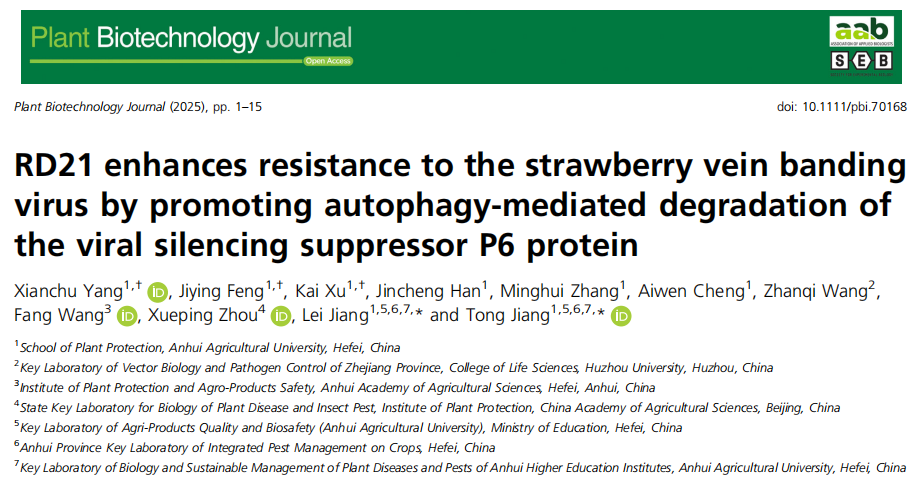 本网讯 近日,我院江彤教授/蒋磊副教授团队在《Plant Biotechnology Journal》在线发表题为“RD21 enhances resistance to the strawberry vein banding virus by promoting autophagy-mediated degradation of the viral silencing suppressor P6 protein”的研究成果。研究发现森林草莓半胱氨酸蛋白酶FvRD21能破坏草莓镶脉病毒(SVBV)重要致病因子P6的功能,还能诱导自噬途径P6蛋白降解,增强森林草莓对SVBV的抗性,并且外源施用脱落酸(abscisic acid, ABA)可促进这一抗病过程。