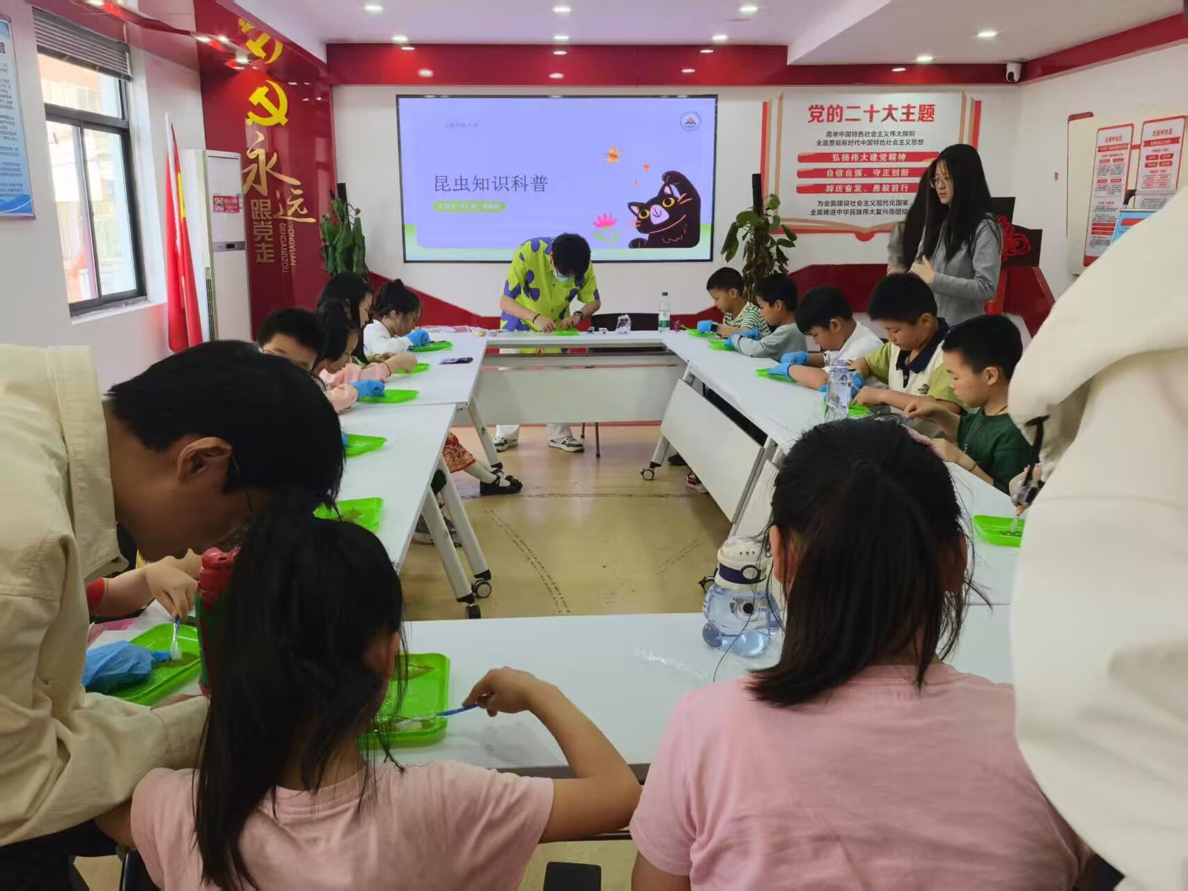 活动开始前,志愿者提前到达活动场地进行准备工作,以确保活动的顺利进行。活动伊始,志愿者们化身“昆虫小老师”,用生动形象的语言和精美的图片,带领小朋友们走进奇妙的昆虫世界。从勤劳的蜜蜂到优雅的蝴蝶,从神秘的甲虫到机灵的蚂蚁,每一种昆虫都仿佛拥有独特的故事,现场气氛热烈,充满了欢声笑语。