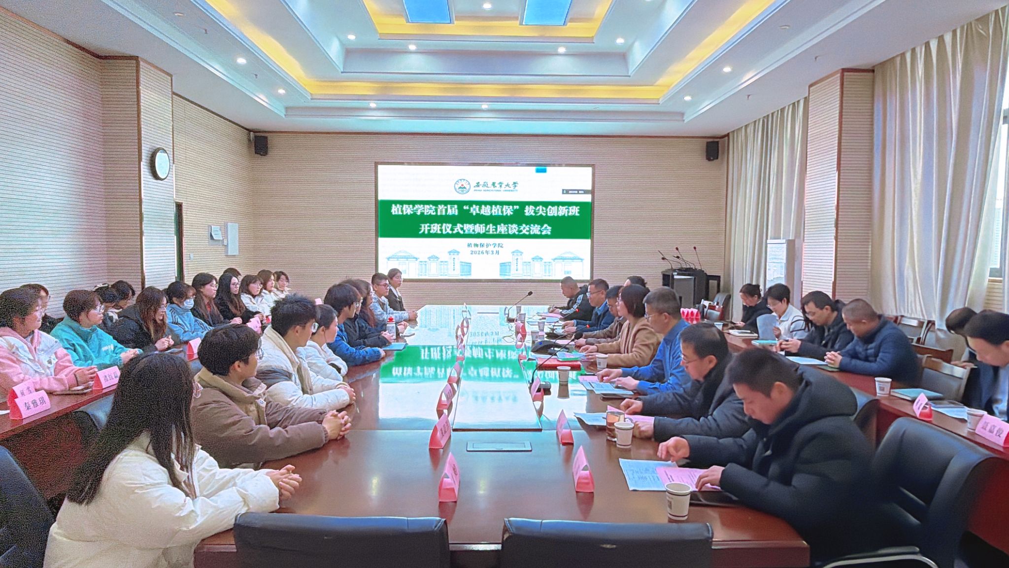 副院长方庆奎详细解读了“卓越植保”拔尖创新班的培养方案与特色亮点。全体导师与创新班学生围绕课程学习、科研方向与未来发展进行了座谈交流。现场交流深入,气氛热烈,掌声不断,取得了良好的效果。(文图/裴志远 编辑/邢文静 初审/方庆奎 审核/刘柳)