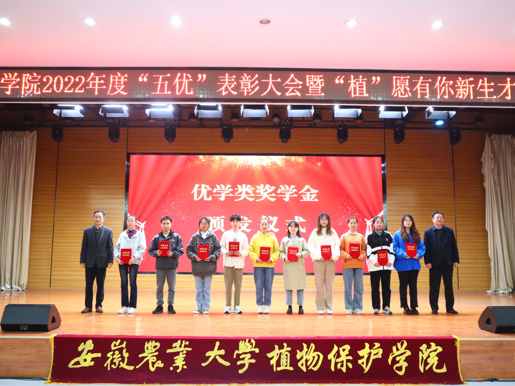 校党委常委、组织部部长韩平,教务处处长曹成茂,学工部部长姚莉,招就处处长刘海涛,后勤保障处副处长江海波,校团委副书记武晓蓓,体育部副主任尹维增,全国模范教师李桂亭,省劳模高智谋,追梦安农人余林生等分别为优学、优创、优体、优美、优劳等五个类别奖学金获奖同学颁奖。学院党政领导班子、学院获得2021年度校级“最美教师”“最美辅导员”“最美教育管理工作者”的教师以及2021年度获得“优中优”奖学金同学分别宣读获奖同学名单。与会同学纷纷表示将向榜样学习、向优秀看齐,争做怀抱梦想又脚踏实地、敢想敢为又善作善成的新时代植保好青年。