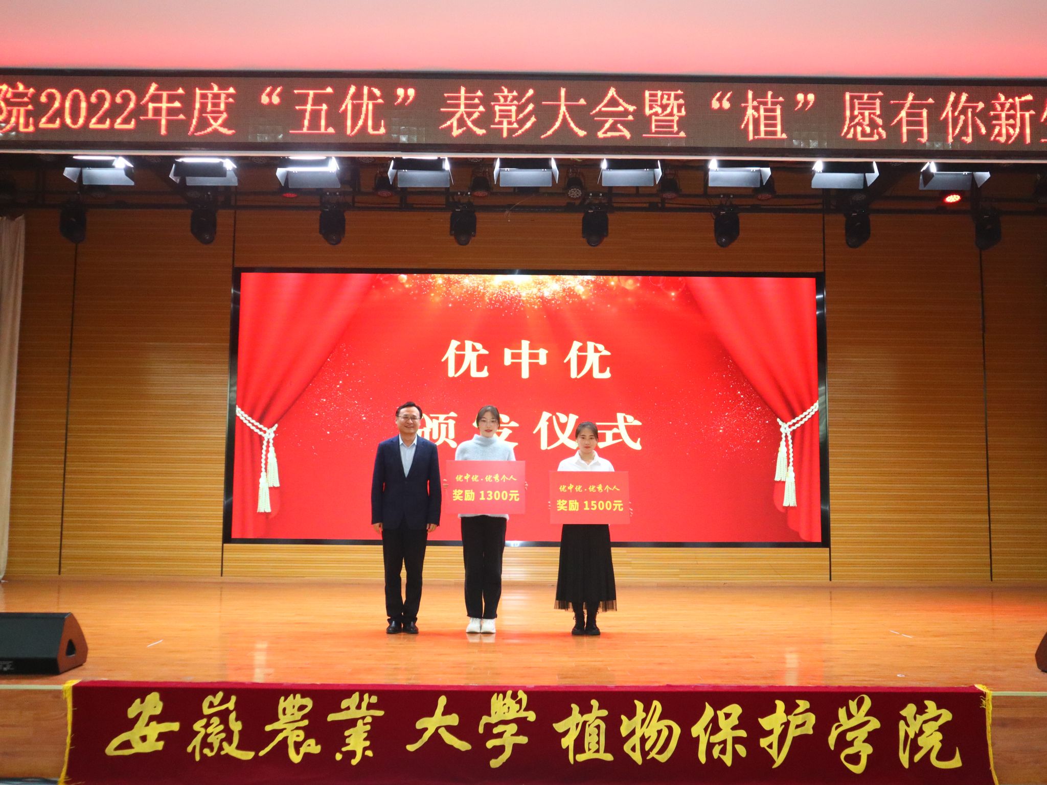 校党委常委、副校长操海群为“优中优”奖学金获奖同学颁奖。“优中优”奖学金中,2019级植物保护专业1班王冰洁、2021级智慧农业专业2班孙卉镁获得“三优奖”。