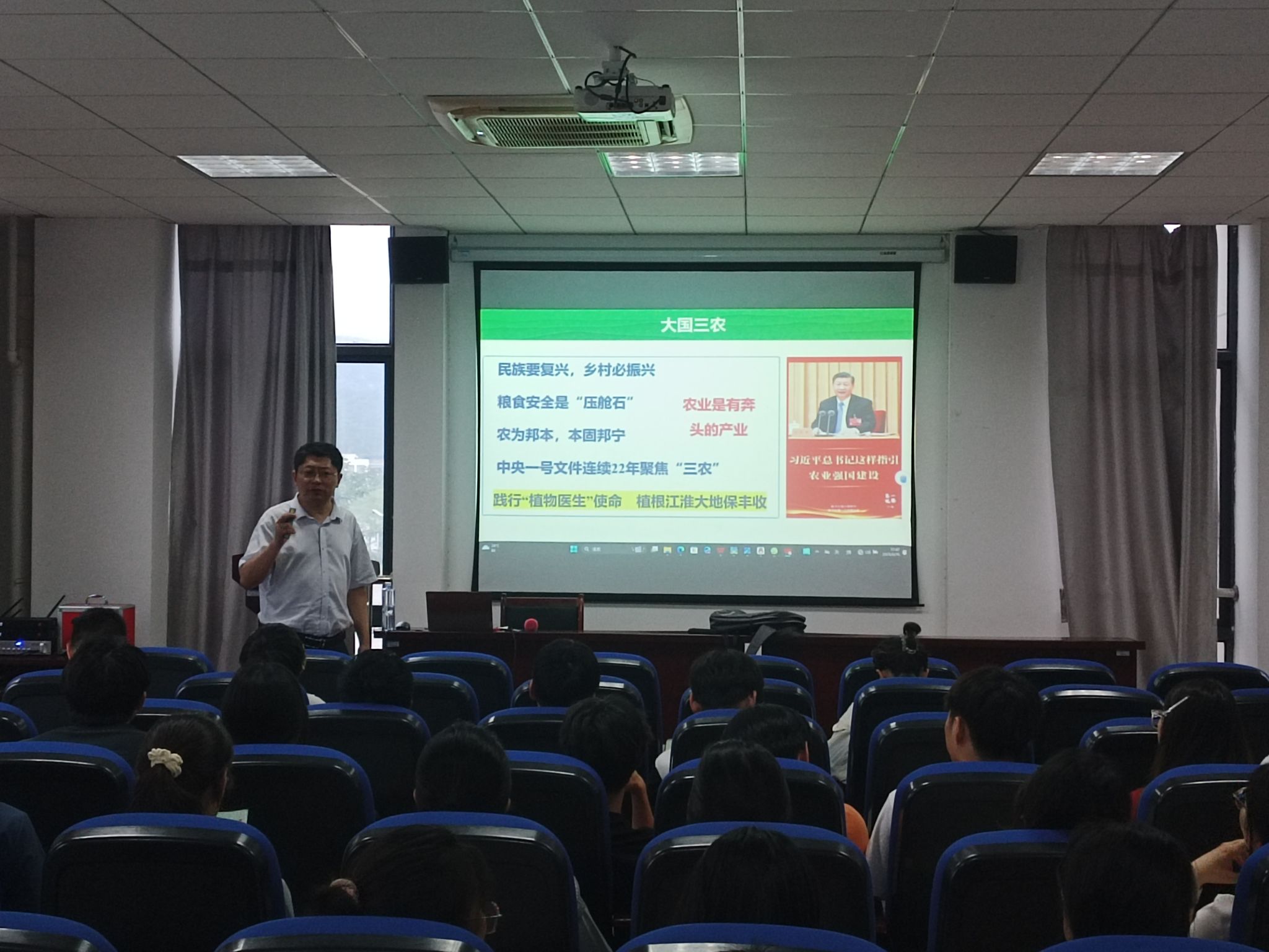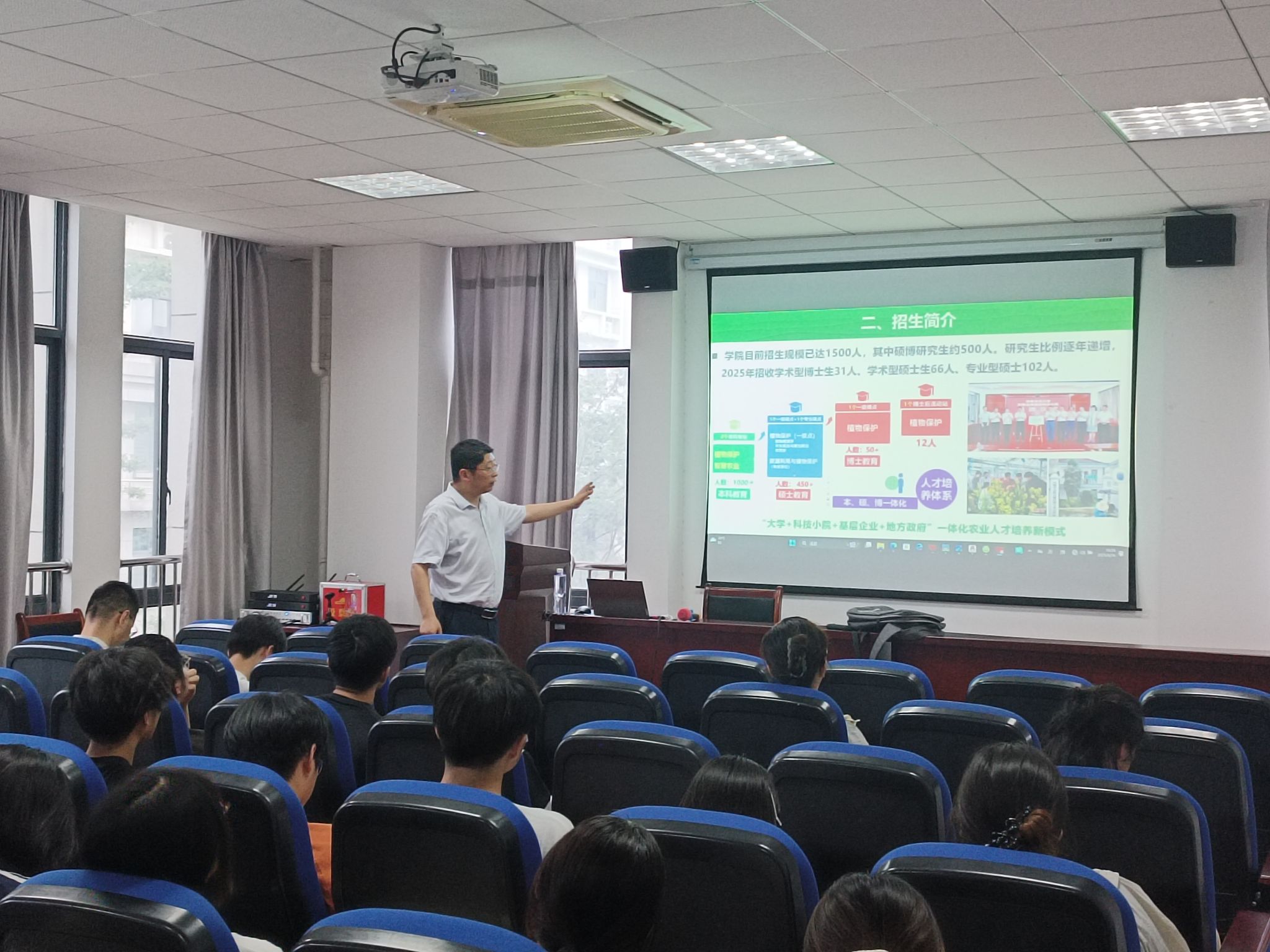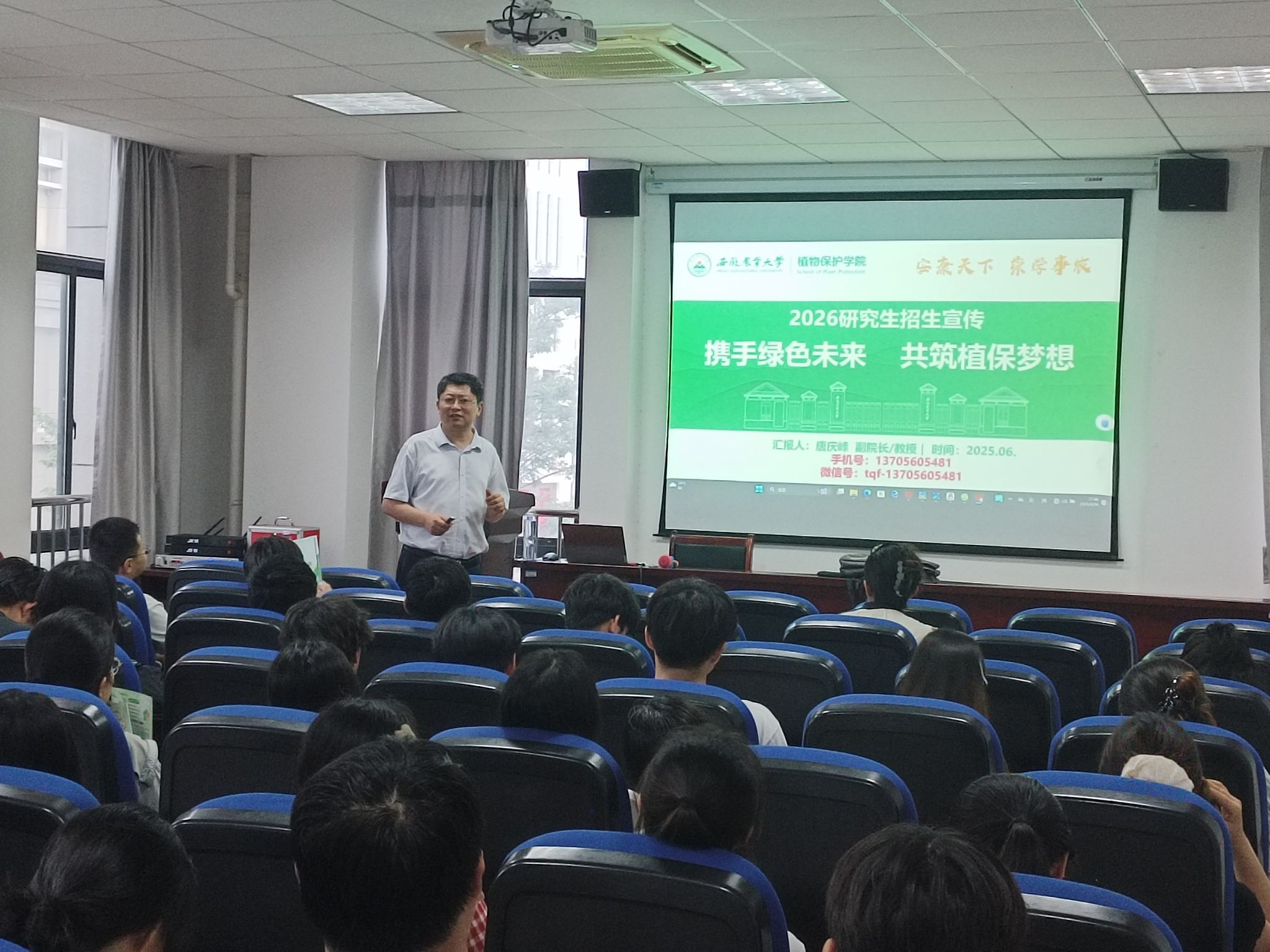 宣讲会上唐庆峰全面介绍了植保学院近几年的研究生招生政策、学科发展历程、雄厚师资力量、省部级科研平台、人才培养成果与优厚的奖助学体系及就业前景。宣讲内容翔实丰富,现场座无虚席,气氛热烈。同学们就关心的导师选择、研究方向、备考策略等问题进行了深入交流。