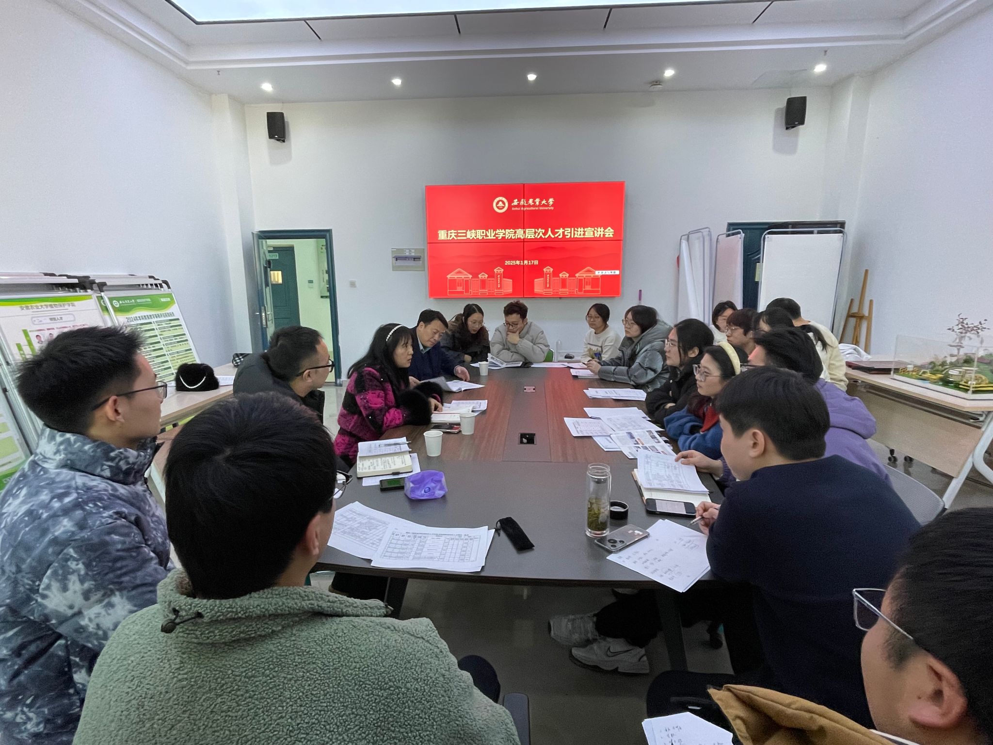 学院举办博士班就业专场招聘会 发布时间:2025-01-17 浏览次数: 本网讯 1月17日下午,重庆三峡职业学院人事处来院开展高层次人才引进宣讲会,院党委副书记、博士生辅导员汪小强,25届、26届博士生参加宣讲会。宣讲会上,重庆三峡职业学院人事处老师介绍了重庆三峡职业学院的发展情况、师资情况、办学定位、人才培养等方面,向博士们重点介绍了学校引进人才的待遇,诚挚向博士们发出邀请,并在会后与博士生们互动交流。(文/图/丁放 编辑/邢文静 初审/汪小强 审核/刘柳)