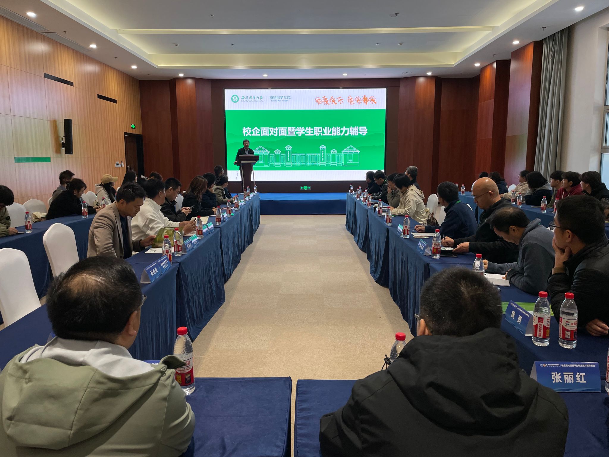 本网讯 11月23日,植物保护学院“校企面对面”暨学生职业能力辅导报告会在滨湖国际会展中心西会议区210室成功举办。先正达(中国)投资有限公司等10家企业负责人,植物保护学院党政领导、师生代表等共计50余人参加了本次报告会。报告会由植物保护学院党委书记刘柳主持。