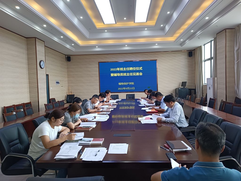 本网讯 9月22日下午,植物保护学院在中西部综合楼1213会议室,举办2022年班主任聘任仪式暨辅导员班主任见面会。副院长唐庆峰,学院2022级、2021级全体辅导员、班主任参加会议。会议由学院党委副书记、纪委书记、副院长汪小强主持。