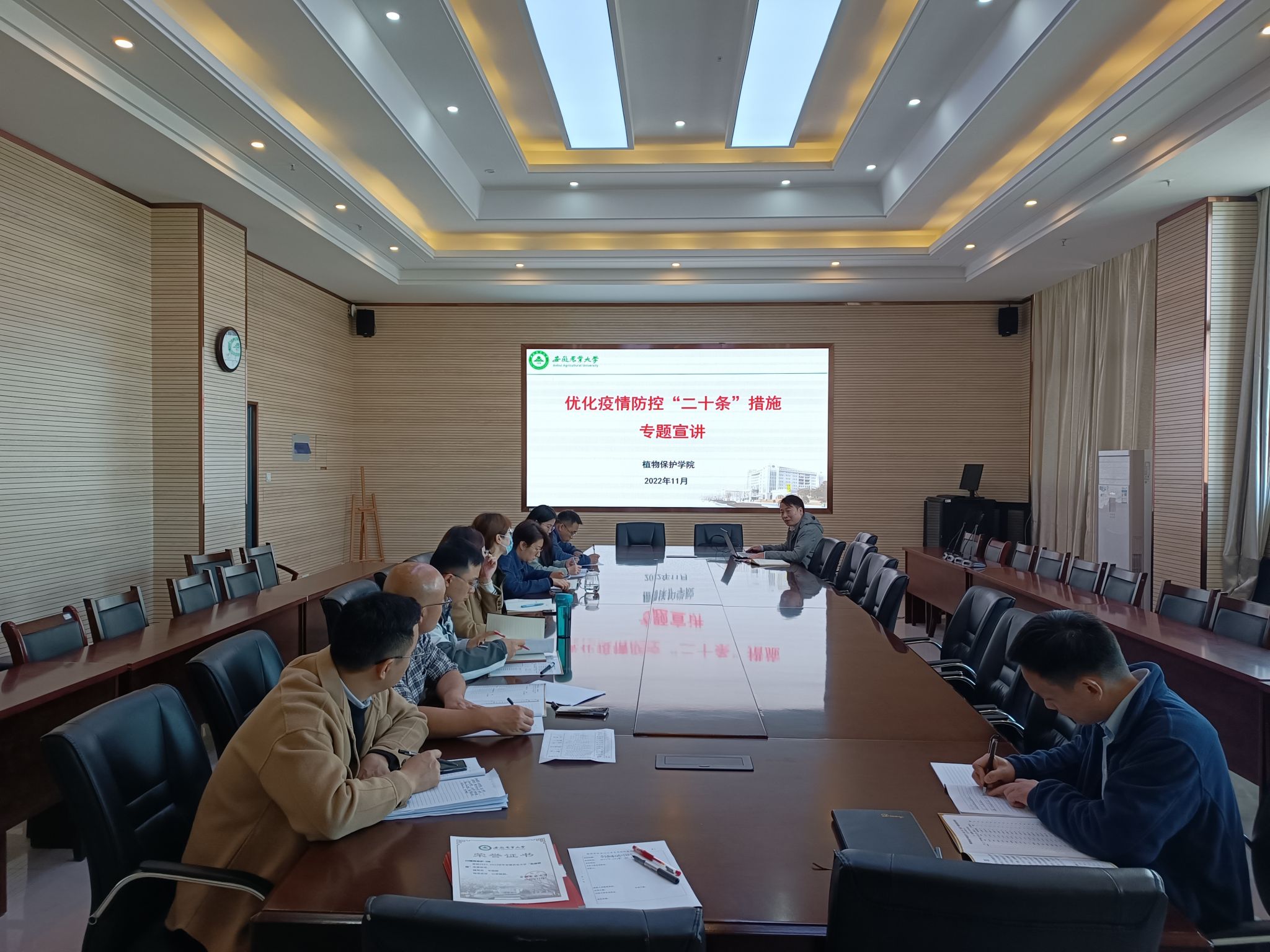 本网讯 11月25日上午,植物保护学院在中西部综合楼1211会议室召开学生疫情防控工作会议,学习传达学校疫情防控工作等会议精神,开展优化疫情防控“二十条”措施专题培训。学院全体专兼职辅导员参加会议。
