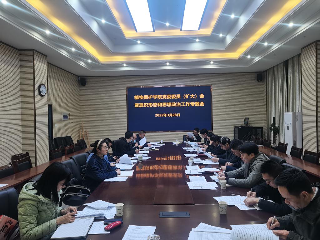 本网讯 3月28日晚,植物保护学院在中西部楼1213会议室召开党委委员(扩大)会暨意识形态和思想政治工作专题会。院党委委员、院意识形态和思想政治工作领导小组成员、全体本科生辅导员、研究生班主任参加会议。会议由院党委书记、意识形态和思想政治工作领导小组组长张平主持。