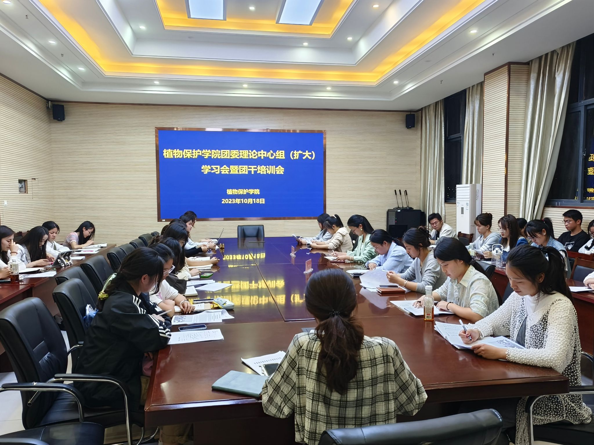 本网讯 10月18日下午,植物保护学院在中西部综合楼1213会议室召开学院团委理论中心组(扩大)学习会暨团干培训会。会议由学院团学工作负责老师主持,学院团委委员和各团支部书记参加会议。