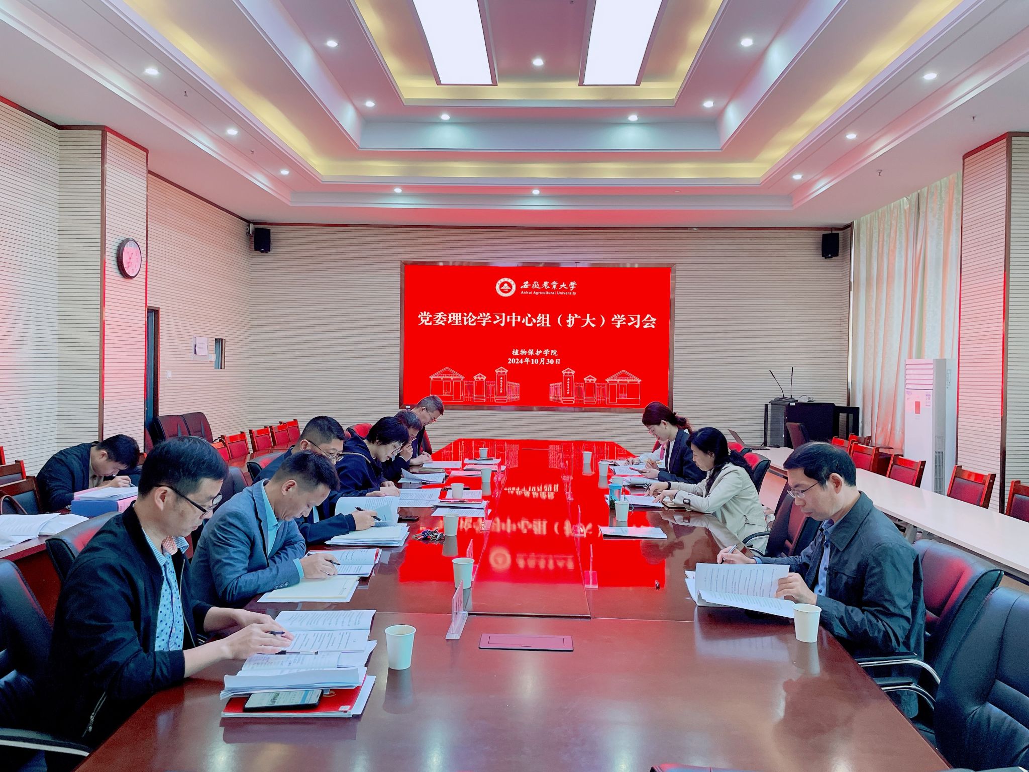 本网讯 10月30日上午,植物保护学院在中西部楼1213会议室召开党委理论学习中心组(扩大)学习会。学院领导班子成员、党支部书记、系部主任、辅导员参会。校党委研究生工作部部长唐红萍、园艺学院党委书记赵冠艳、生命科学学院党委书记曹雷、党委研究生工作部朱晓晨老师列席旁听。会议由学院党委书记刘柳主持。