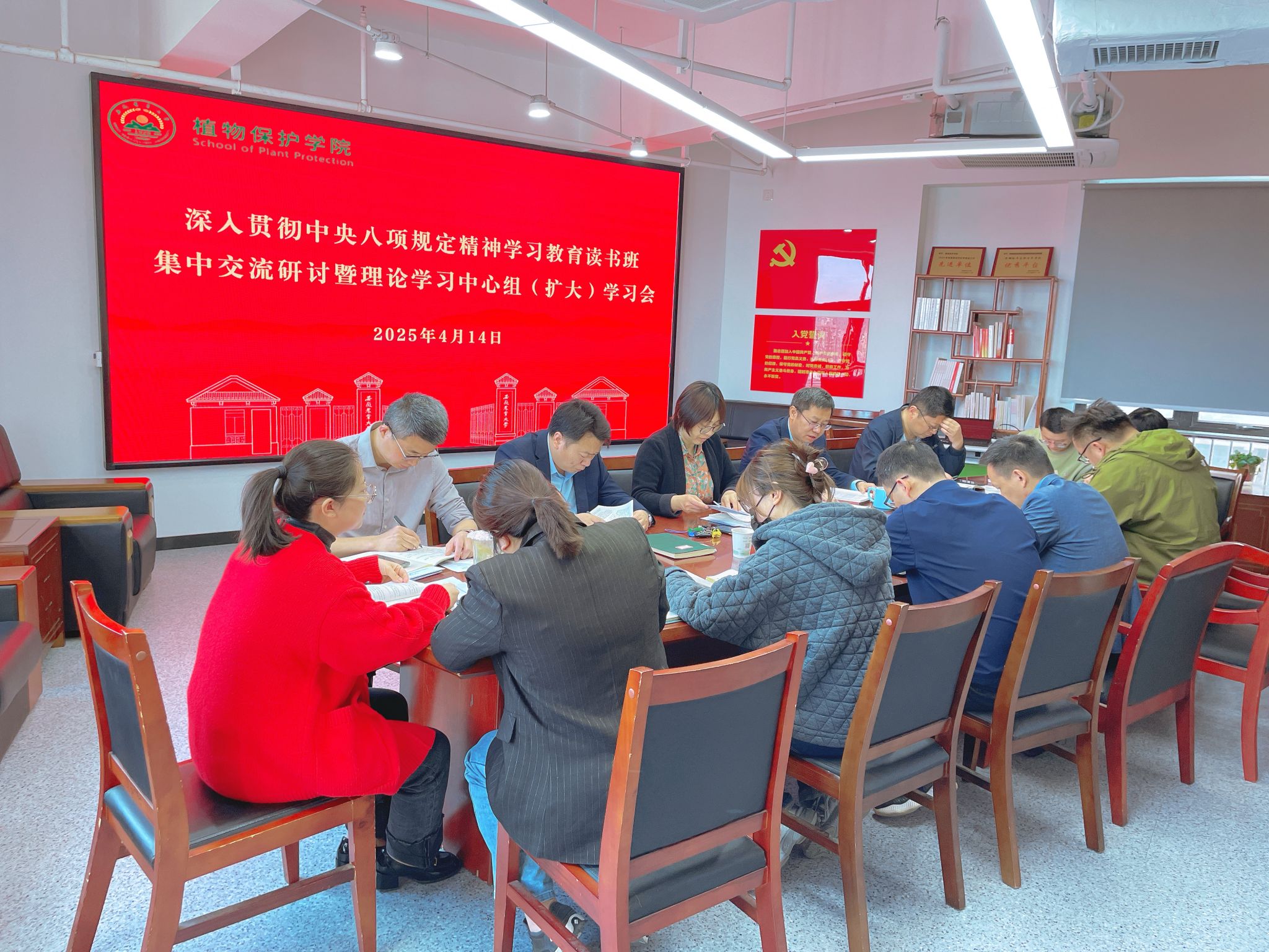 本网讯 4月14日,植物保护学院党委举办深入贯彻中央八项规定精神学习教育专题读书班暨理论学习中心组(扩大)学习会。学院领导班子、党支部书记、系部主任、科级干部、辅导员参加会议,会议由学院党委书记刘柳主持。