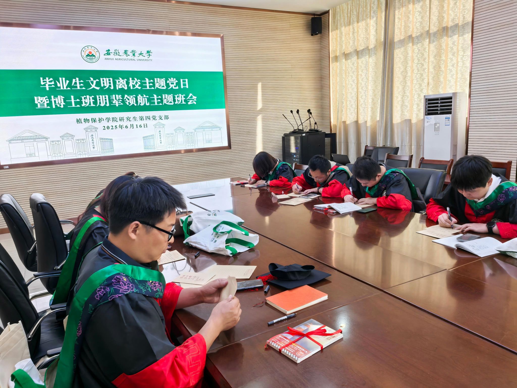 会议集体观看了学校毕业微视频《青春不散场》,共同学习了中共中央办公厅、国务院办公厅印发的《关于加快推动博士研究生教育高质量发展的意见》,为上半年过政治生日的学生党员赠送了贺卡,为全体毕业生赠送了朱光潜先生所著的《给青年的十二封信》书籍。会后,与会毕业生饮水思源、展望未来,认真撰写一封信,寄语2025级新生。(文图:邓孟晴 初审:邢文静 复审:汪小强 终审:刘柳)