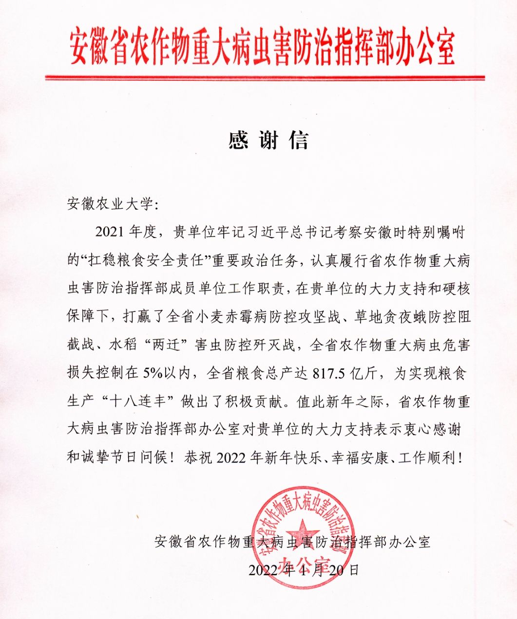 本网讯 近日,安徽省农作物重大病虫害防治指挥办公室发来感谢信,高度肯定我校2021年度在打赢全省小麦赤霉病防控攻坚战、草地贪夜蛾防控阻截战、水稻“两迁”害虫防控歼灭战等方面的大力支持和硬核保障,对我校为全省粮食“十八连丰”做出的积极贡献表示感谢。