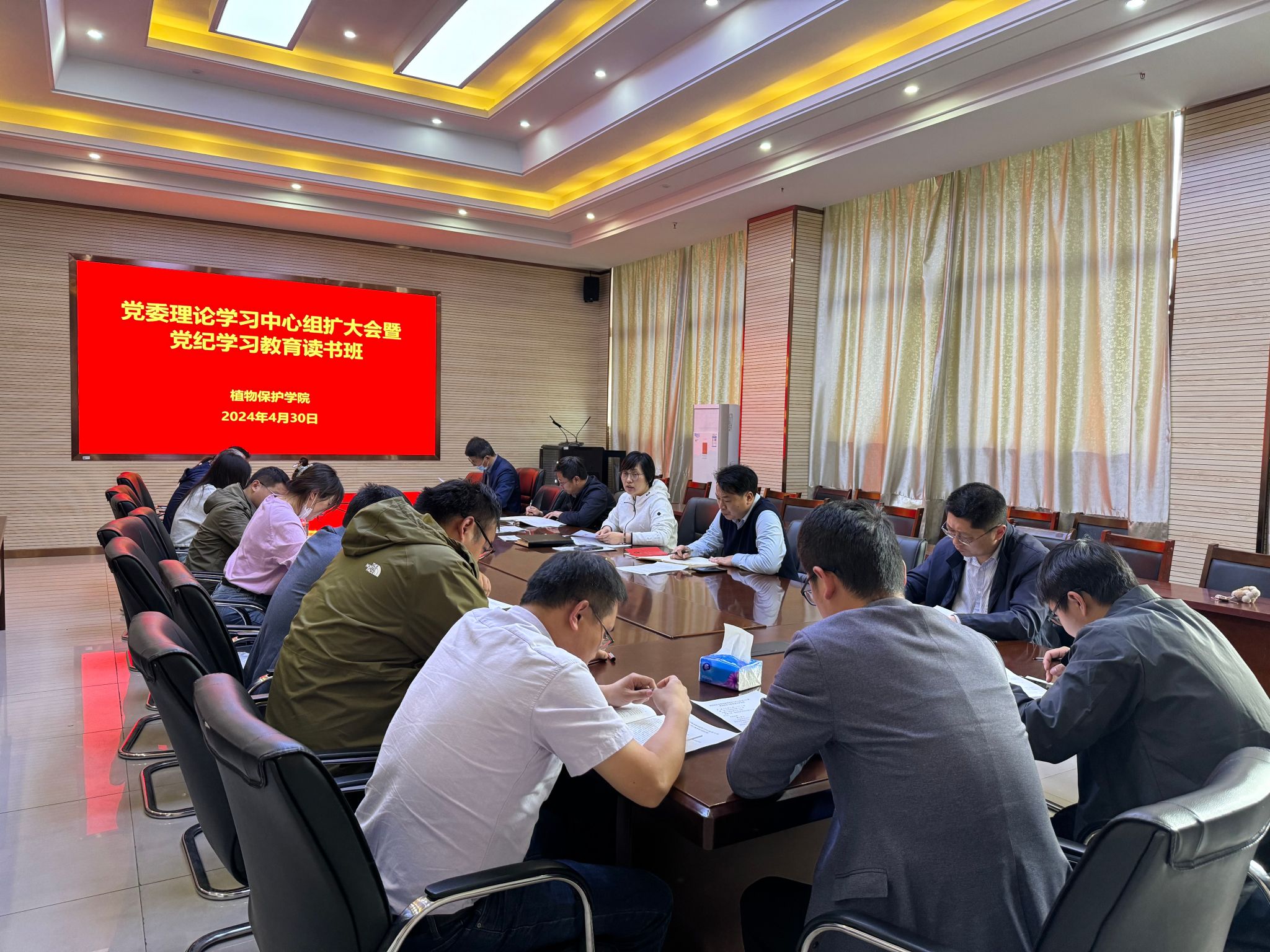 本网讯 4月30日,植物保护学院在中西部综合楼1213会议室召开党委理论学习中心组(扩大)会暨党纪学习教育读书班。学院领导班子成员、党支部书记、副书记以及党政办全体人员参加会议,会议由院党委书记刘柳主持。