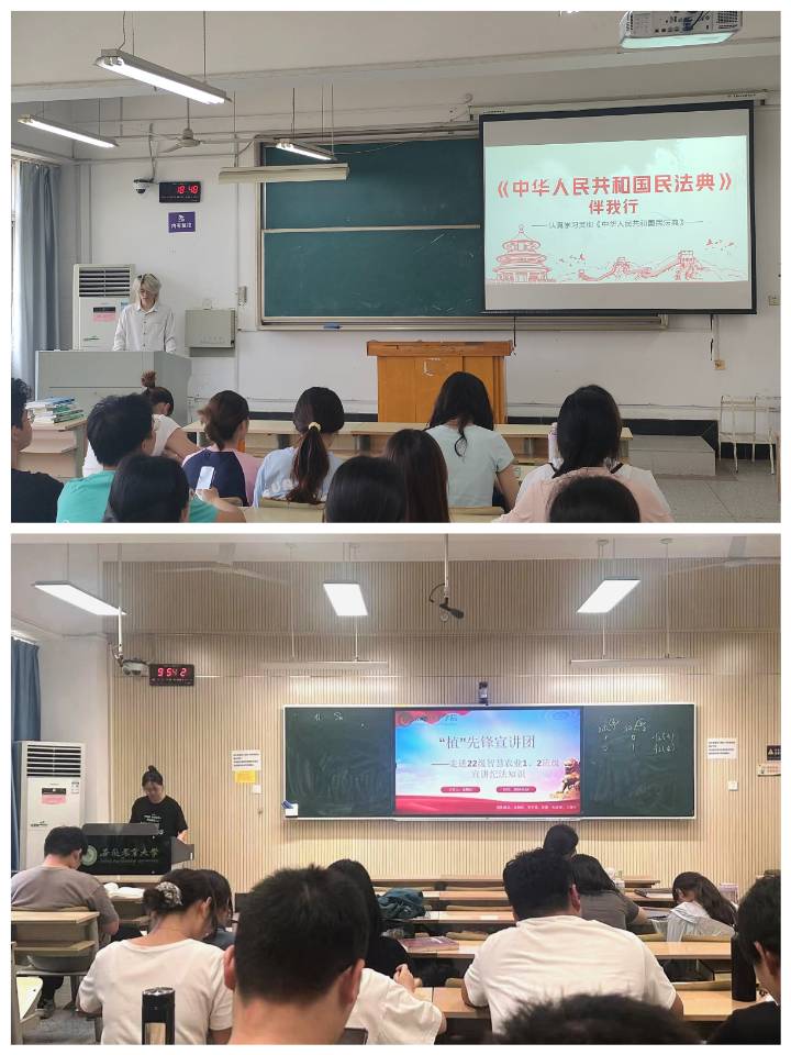 游璐小组以“《中华人民共和国民法典》伴我行”为主题,从民法典的概况与地位、民法典对大学生的重要性、民法典与高校学生生活联系等三个层面进行民法典普及,让同学们意识到民法典的重要性,同时了解到正确使用法律对维护自身权利的重要性;金桐妃小组以“《中华人民共和国民法典》中关于高校学生的法律常识”为主题,介绍了民法典基本内容,强调纪法教育的重要性,用实际案例介绍知识产权、隐私权、物权在生活中的应用,帮助大家理解法律在日常生活中的重要作用,引导同学们自觉遵守各项法律法规,共同维护良好社会秩序。