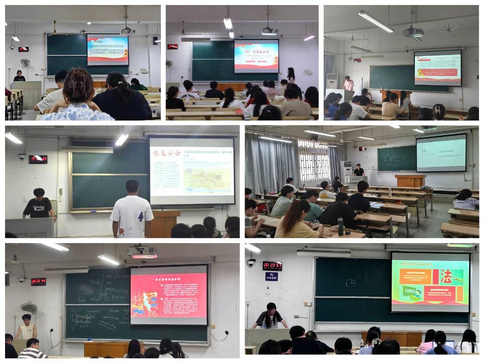 艾丝雨小组以“知法懂法,遵纪守法,学会用法”为主题,让同学们感受到了遵纪守法、正确使用法律维护自身权利的重要性;桂书燕小组以“纪法知识在心间”为主题,分别从网络安全、财产人身安全、大学生群体存在其他不正确的行为等四个方面对日常生活可能涉及的法律知识进行了详细讲解;王向阳小组以”纪法知识伴我行“为主题,从纪法与国家治理的关系、纪法在社会秩序中的作用和遵纪守法的重要性三个部分向同学们讲述;张栋梁小组以“纪法安全人人有责、遵纪守法人人必行”为主题,从介绍纪法知识、遵守网络安全法、粮食安全保障法和如何利用法律保护自我等三个维度让同学们对于纪法有了更深刻的认识和全新的感悟;顾明强小组以“大学生纪法意识教育”为主题,从纪法知识教育重要性和大学生遵纪守法该怎么做两个内容进行宣讲,从同学们身边的小事分析,让大家了解了纪法知识及其教育的重要性;祝麟小组以“传播纪法智慧,铸就社会正义之基”为主题,通过详细解读相关纪法条例和案例,提高同学们的法治意识;赵传弟小组以“学习提升学生纪法意识、加强纪律教育法治教育”为主题,通过宣讲普及其他应知应会的纪法知识,拓宽了同学们的视野,增强了同学们的法律素养。