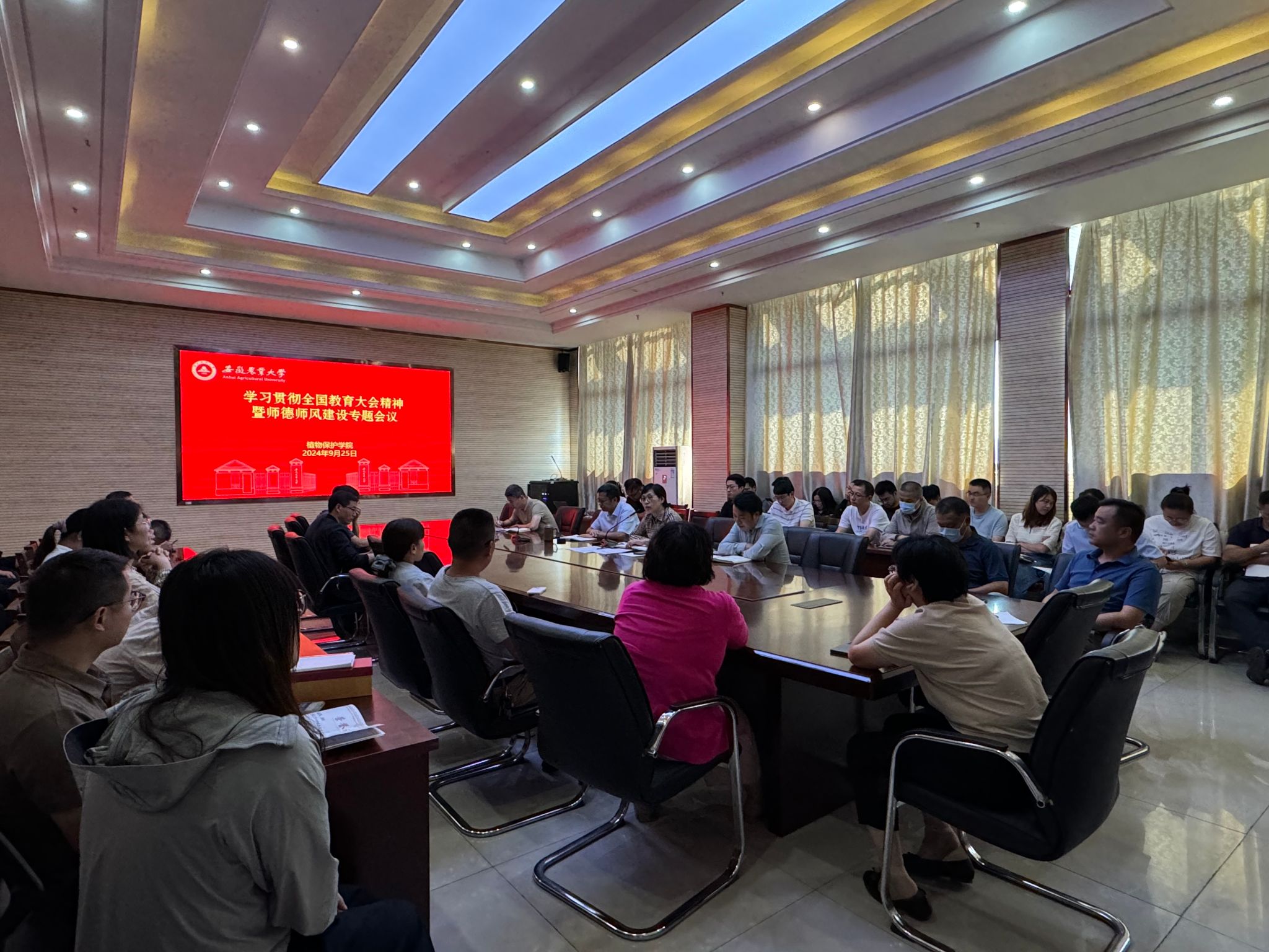 本网讯 为深入学习贯彻全国教育大会精神,加强师德师风建设,大力弘扬教育家精神,9月25日下午,植物保护学院贯彻全国教育大会精神暨师德师风建设专题会议在中西部楼1213会议室举行。学院党政领导、全体教职工参加会议。会议由学院党委书记刘柳主持。