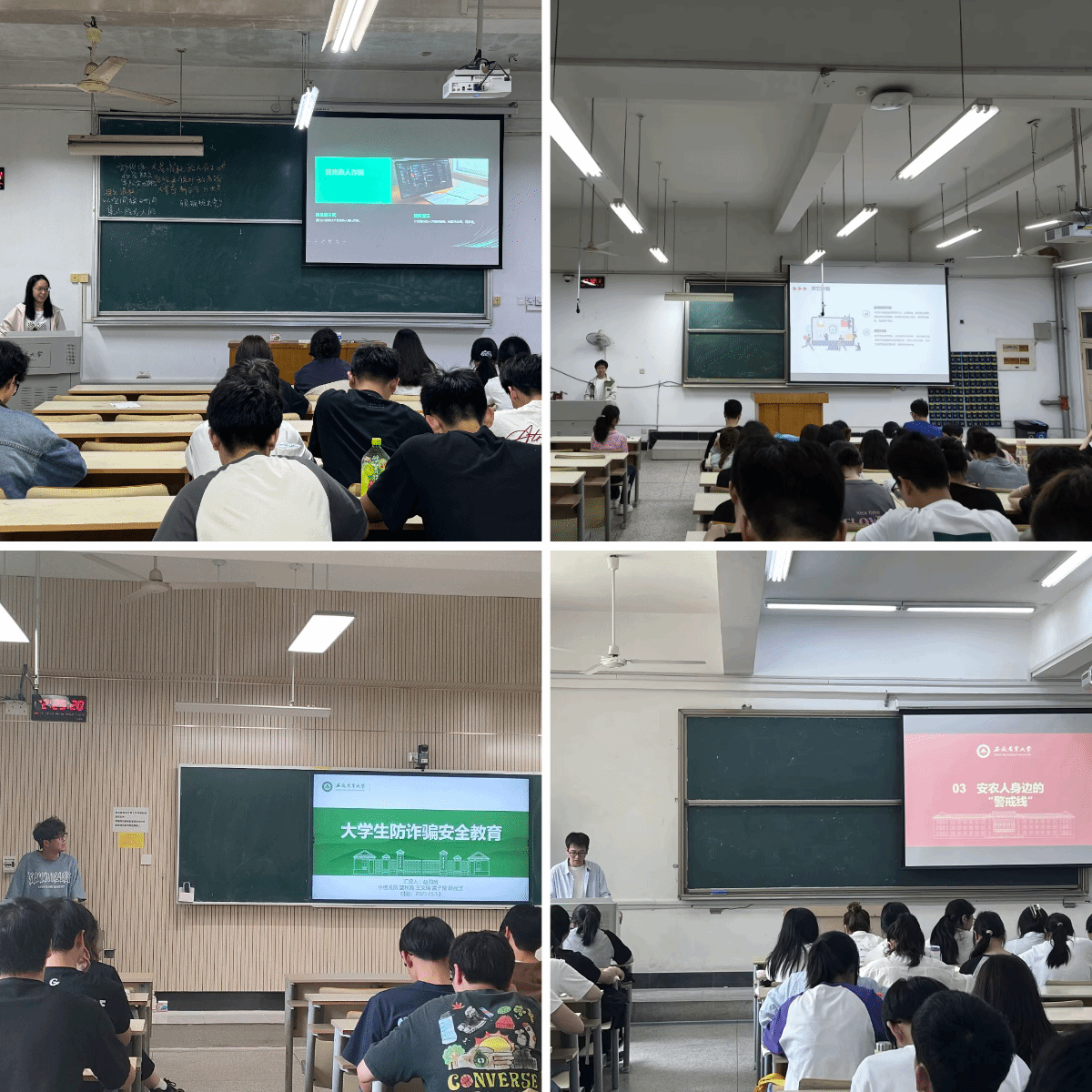 徐瑞小组以“从校园到社会的必修课”为主题,通过案例分析、法规解读、现场互动等形式,向同学们阐释了党纪国法的重要性;马明锐小组以“大学生防诈骗指南”为主题,从诈骗类型介绍,了解常见诈骗手段和大学生防诈知识三个方面展开,提高了同学们的反诈意识和安全意识;李盛世小组以“防诈骗与网络安全宣传”为主题,采用播放典型案例视频让同学们深刻认识到诈骗手段的多样性和隐蔽性,也学到了许多实用的防骗技巧;张珂小组以“警惕诈骗陷阱,守护财产安全”为主题,用丰富的案例,生动揭露了诈骗分子的狡猾手段,让同学们意识到,诈骗就在我们身边,稍有不慎就可能落入陷阱;赵洞明小组以“防诈同心,安全同行”为主题,通过解析诈骗案例,以及科普遭遇诈骗后的正确处置流程,帮助同学们守牢安全防线,共同守护美好校园生活;陈征征小组以“纪法意识和反诈意识”为主题,围绕为什么要增强纪法意识,大学生常见法律风险案例,诈骗的常见形式与识别,以及防诈实用技巧等四个方面展开,切实增强了同学们的反诈骗意识。
